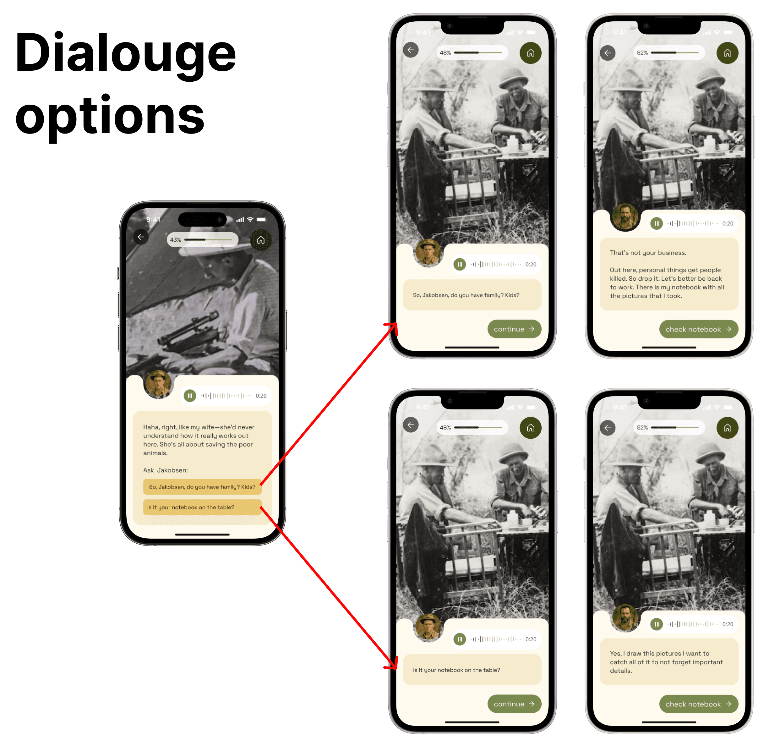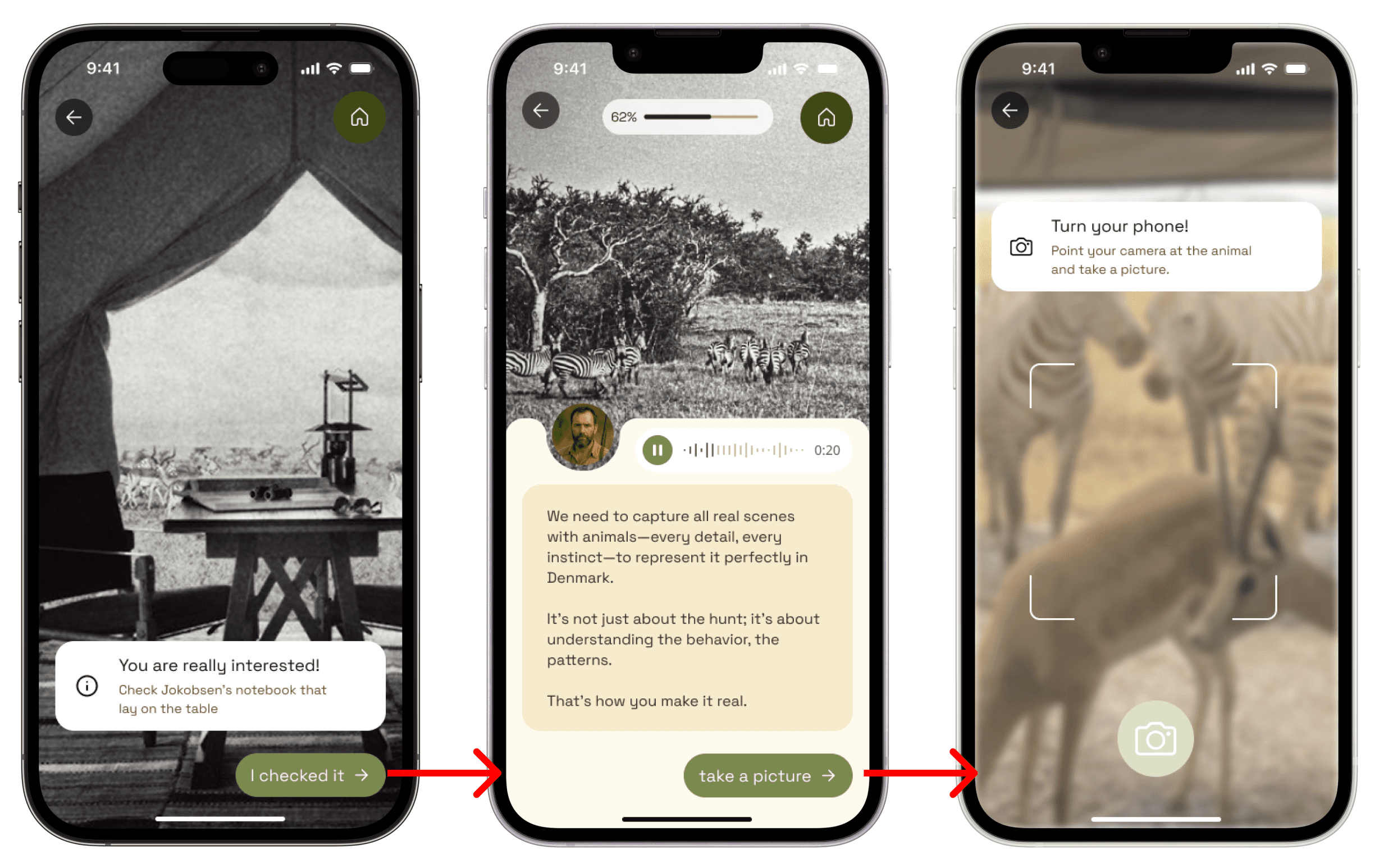 A narrative-driven app that transforms the Africa Expedition exhibition into an immersive digital story. Visitors step into the shoes of an expedition member, facing moral dilemmas and exploring history through dialogue choices, AR scenes, and contextual storytelling.